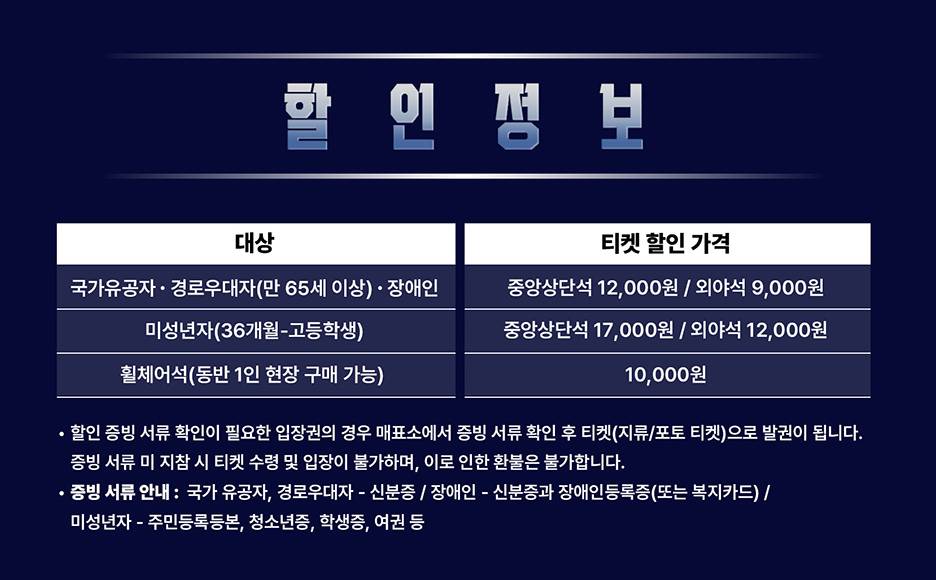- 무통장입금(가상계좌) 선택 시 예매 당일 23:29 마감.